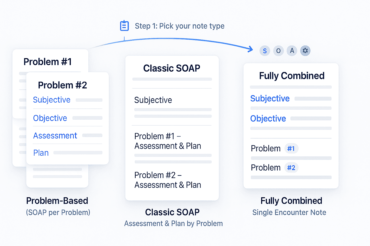 You can move seamlessly along the spectrum—from fully problem-based notes (SOAP per problem) to encounter-based notes (S/O/A grouped by visit). Even in encounter mode, Stream can still apply problem-specific mini-templates, ensuring consistent organization and carry-forward structure.